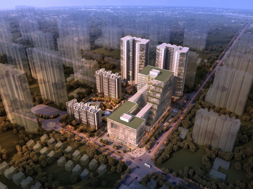 本項目位于江蘇昆山花橋,曹安路與兆豐路交匯處,是昆山市重點開發區域之一。本項目的規劃設計在功能結構與布局上,在城市總體規劃的引導下,積極引入城市設計的內容,發揮建筑設計及環境設計的能動作用。本工程為商住混合用地,主要含4棟高層住宅樓、一棟商業辦公綜合樓。基地用地面積31438.4㎡,容積率4.96,地上計容總建筑面積156267㎡。地下總建筑面積約27590㎡。