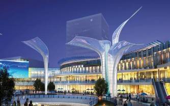 該項目總建筑面積達23萬平米,由購物中心、綜合商業樓、商業街三大塊組成。購物中心建筑面積185613㎡,地上三層為主,局部四層、地下一層;綜合商業樓建筑面積29059㎡,地上十三層、地下一層;商業街建筑面積21039㎡,地上二層。地下一層建筑面積達數萬平米,通常包括變電所、水泵房、人防工程(平時地庫)、冷凍機房、消防控制、生活水泵房、自行車庫、倉庫、下沉式廣場等功能設施。結構形式都為鋼筋混凝土框架結構。